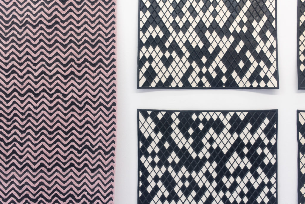 2 draps de bain en coton, 4 tapis de voiture en caoutchouc, 13 moules à chocolat en polycarbonate, peinture glycérophtalique noire, peinture glycérophtalique blanche, 1 sculpture motorisée de Robert Breer. Pour la vitrine du Frac Île-de-France, Anthony Bodin présente un état momentané du stock de ses peintures récentes.