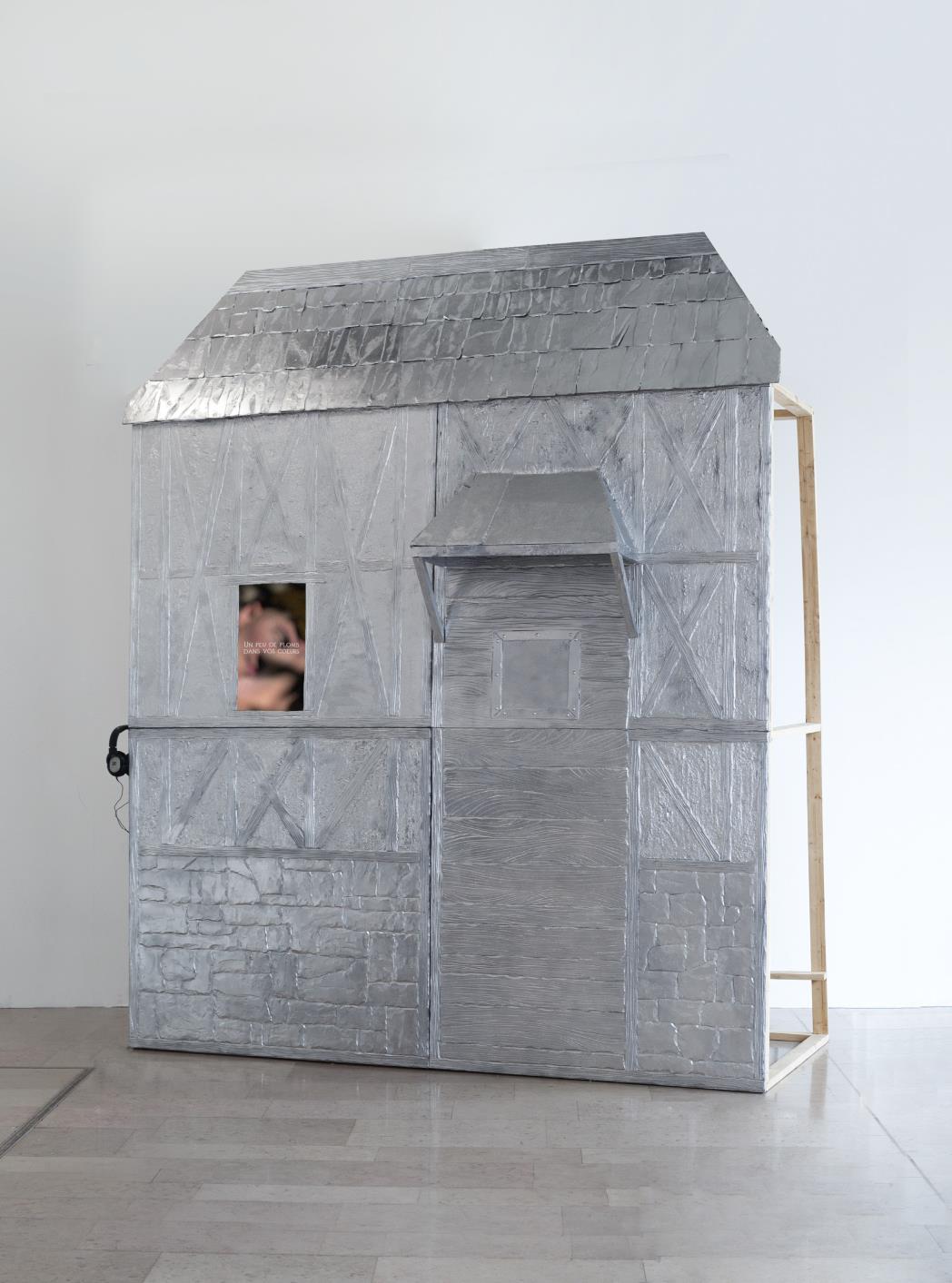 MDF, plâtre, bois, peinture chromée, vidéo, 5 min, 310 x 245 x 85 cm.