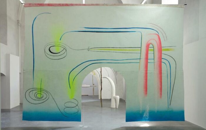 Toile de jute peinte recto verso, gesso, peinture à l’aérographe, peinture acrylique, peinture à l’huile, pastel, fusain, 430 x 594 cm.