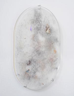 Mites et papillons en décomposition, verre, électricité statique, 34,3 x 24,1 x 1,3 cm ;