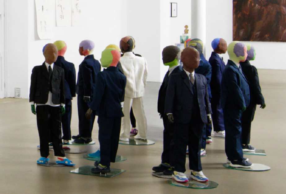 16 mannequins enfants, costumes trois pièces, chaussures, socles, silicone, peinture à l’huile, acrylique, plâtre, dimensions variables
