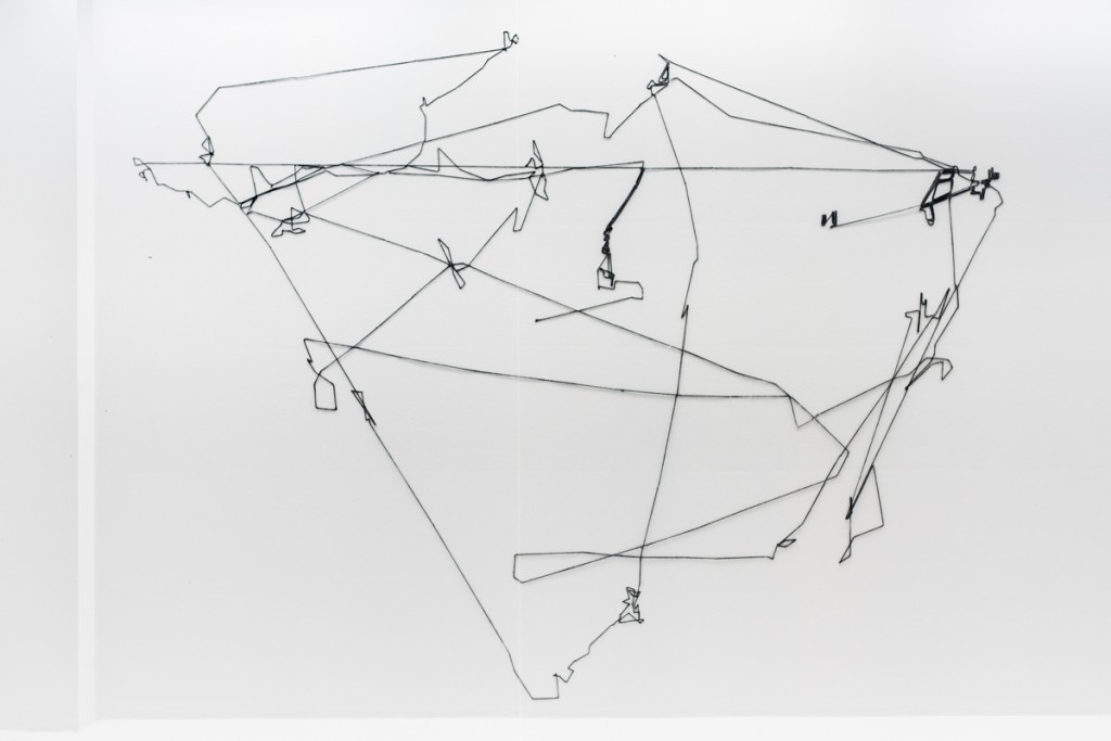 Julien Prévieux a mené une expérience de quantification des regards des visiteurs sur les œuvres de l’exposition collective Paint it black, présentée au plateau (14.03 – 12.05.13), avec des œuvres de la collection du frac île-de-france. A la suite de l’exposition, les dessins – traduction des regards des participants sur les œuvres – ont été réalisés avec du fil de laine et photographiés au fil des salles du plateau, à la place des œuvres regardées.