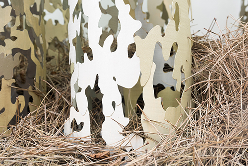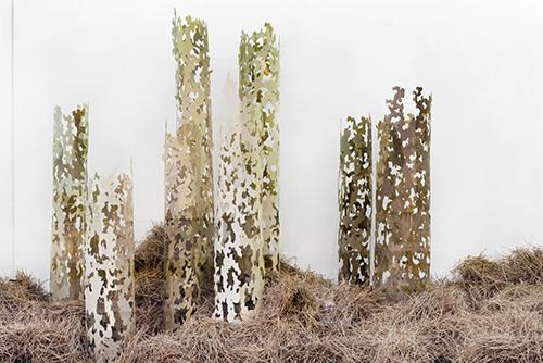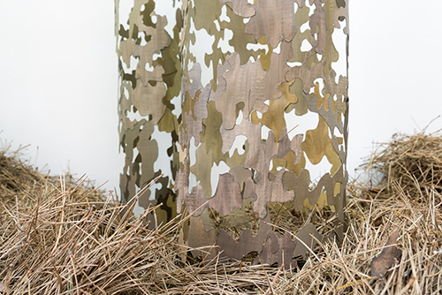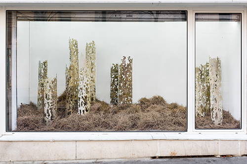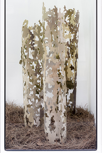 Pour la vitrine, l’artiste élabore un paysage qui associe la transparence d’un bosquet d’arbres habités par un vide central et la fluidité d’une vague d’aiguilles de pin.