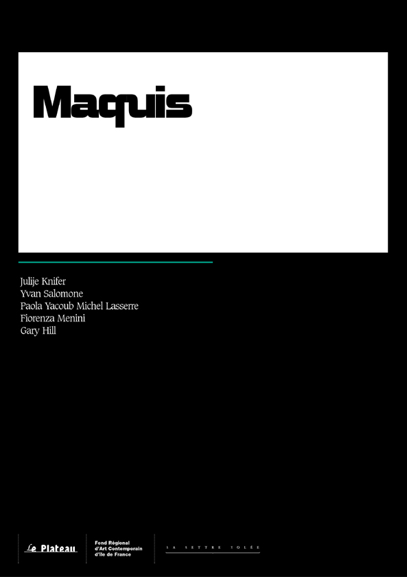 L’exposition Maquis a réunit au Plateau, à Paris, cinq artistes de générations différentes travaillant sur des médiums spécifiques (vidéo, aquarelle, wall-painting, dessin, diaporama). Le terme « maquis » est à entendre dans son sens métaphorique : un territoire aux contours mouvants dans lequel les artistes développent leur expérience intime et historique du temps et de l’espace ; un lieu où les notions de traces, de passages sont sans cesse à redéfinir ; un espace de résistance où chacun élabore sa « stratégie ». Gary Hill présente une installation vidéo, Fiorenza Menini un film en temps réel, Yvan Salomone une série de 30 aquarelles, Julije Knifer des dessins et des peintures et Paola Yacoub Michel Lasserre deux diaporamas.