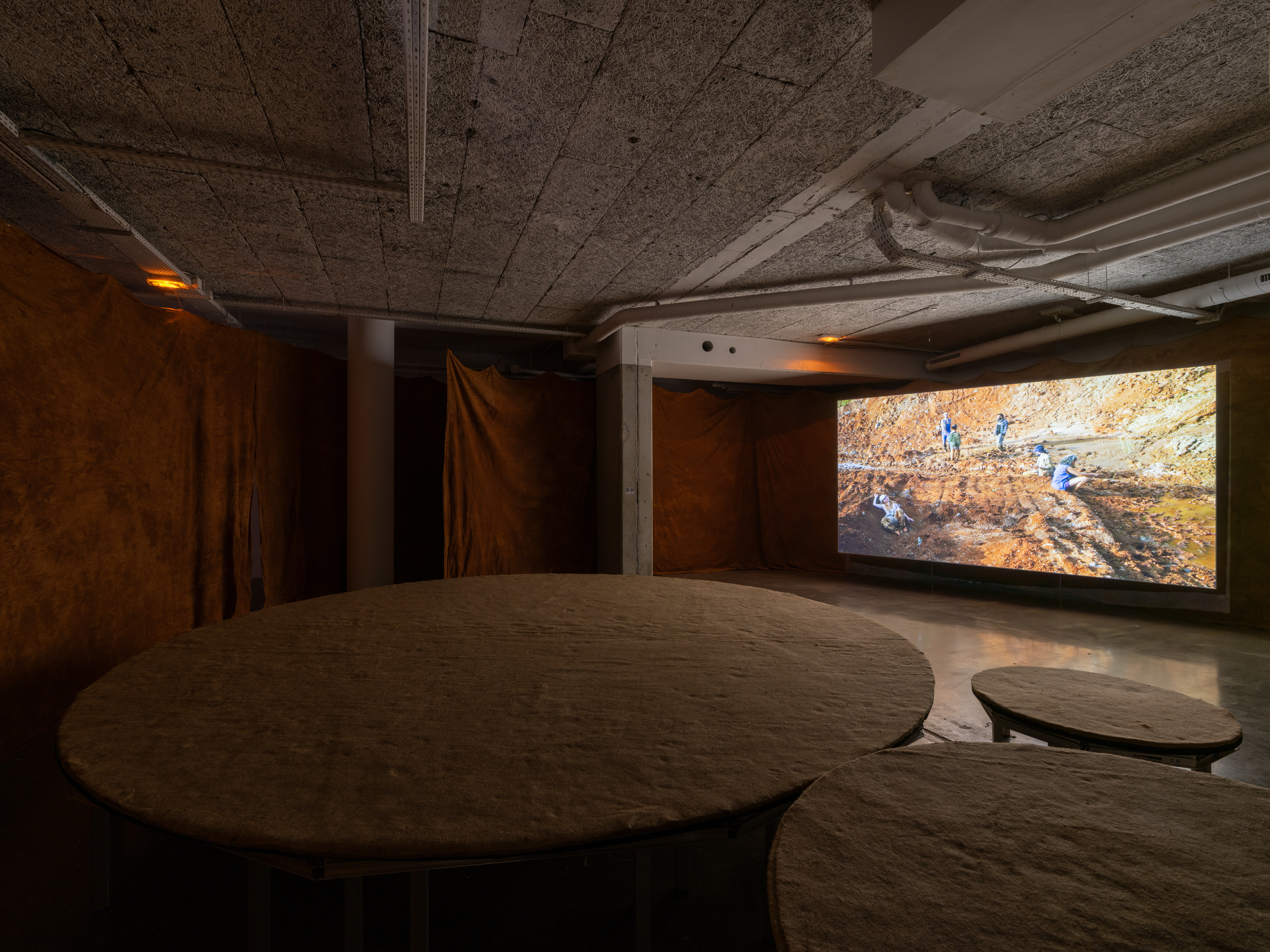 L’exposition est centrée sur une nouvelle œuvre vidéo, tournée dans différents paysages de Lituanie. L’installation filmique se présente comme une tentative spéculative et performative de traduire la recherche archéologique et ses matériaux, tels que les figurines d’argile et les vestiges des temples et des sites funéraires, en poésie, en images en mouvement et en chorégraphies autour du collectif et de la relation intime entre le corps et la terre.