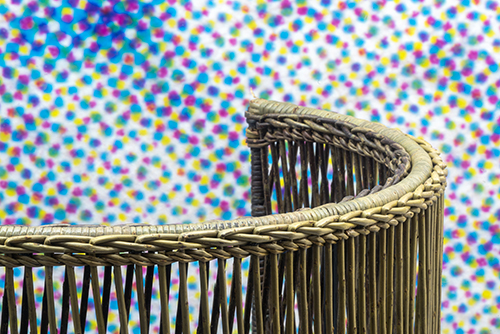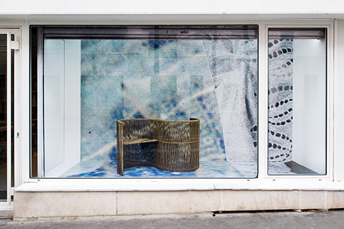 Pour la vitrine, l’artiste conçoit une œuvre originale, assemblage d’un papier peint et d’un confident, réalisé en osier – procédé emprunté à l’artisanat. Le siège, qui comporte deux assises, évoque une position corporelle d’interaction entre deux personnes. L’ensemble forme un collage sollicitant la perception du passant. Entre les motifs tramés des images et le moirage de l’objet, s’établit un jeu optique, un creusement de la surface.