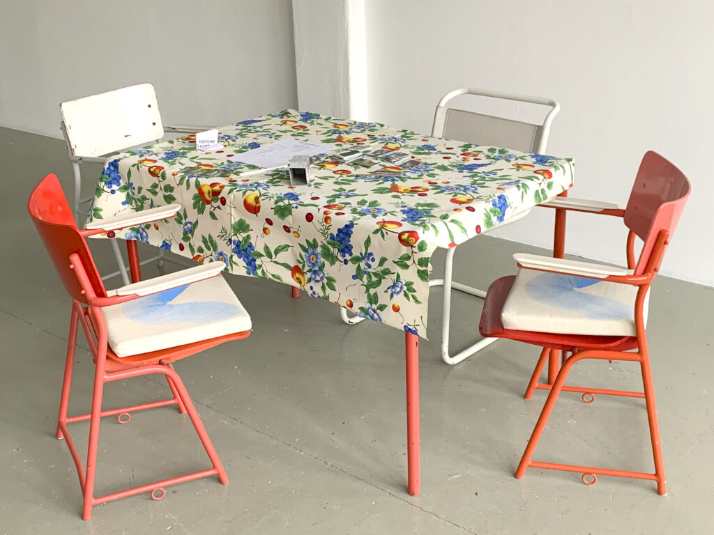 Quelques œuvres l’entourent d’un cadre familier : une lampe, un guéridon, et par terre sur la moquette, un jeu de retourne-cartes fait d’images de maisons, de voitures et de chiens dont il faut retrouver les paires éparpillées. C’est comme si des enfants venaient d’y jouer. »