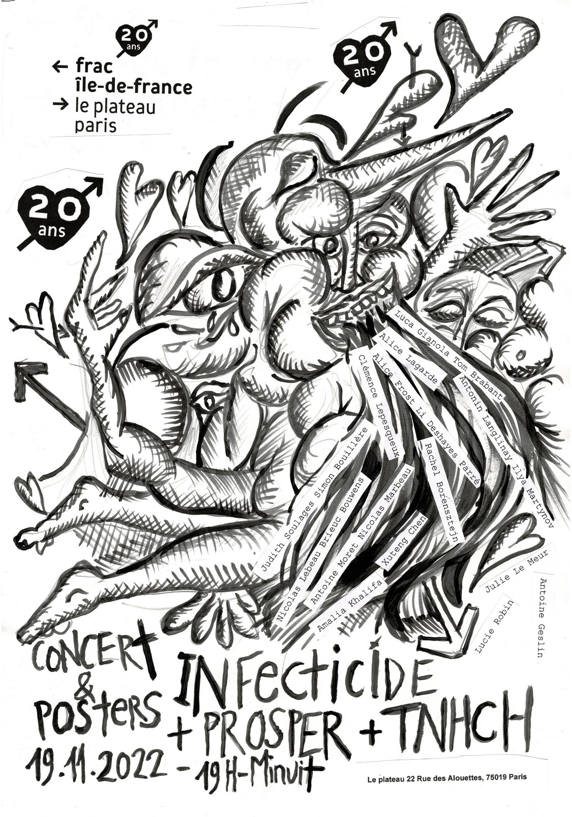 The 20 posters were created by : Rachel Borensztejn, Simon Bouillère, Brieuc Bouwens, Tom Brabant, Xuteng Chen, Li Deshayes Parré, Alice Frost, Antoine Geslin, Luca Gianola, Amalia Khalifa, Alice Lagarde, Antonin Langlinay, Nicolas Lebeau, Julie Le Meur, Clémence Lepesqueux, Nicolas Marbeau, Ilya Martynov, Antoine Moret, Lucie Robin and Judith Soulages, coming from the following art schools : ENSAPC Cergy, ENSP Arles, ENSA Bourges, EnsAD, Beaux-Arts de Paris, Ateliers de Sèvres, École supérieure d’art d’Aix-en-Provence, EESAB Rennes, Université Paris I Panthéon-Sorbonne.