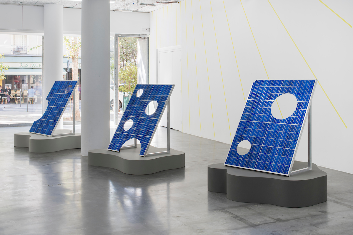 This mastery of the environment is also expressed in sculptures made from solar panels that have been nibbled like a Swiss cheese or have holes in them so that we can see through them and observe what is behind them. The instrumentalisation of the landscape that she enables us to see also animates the sculptures of animals that recall a nature that has become serialized and dehumanized, a world where rationality prevails over attention to the living.