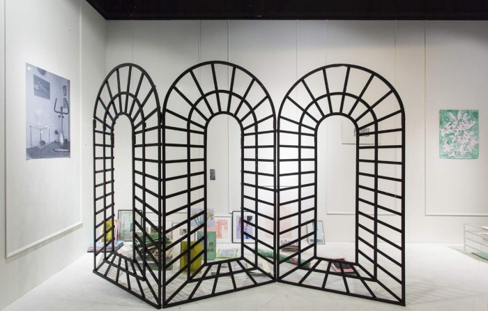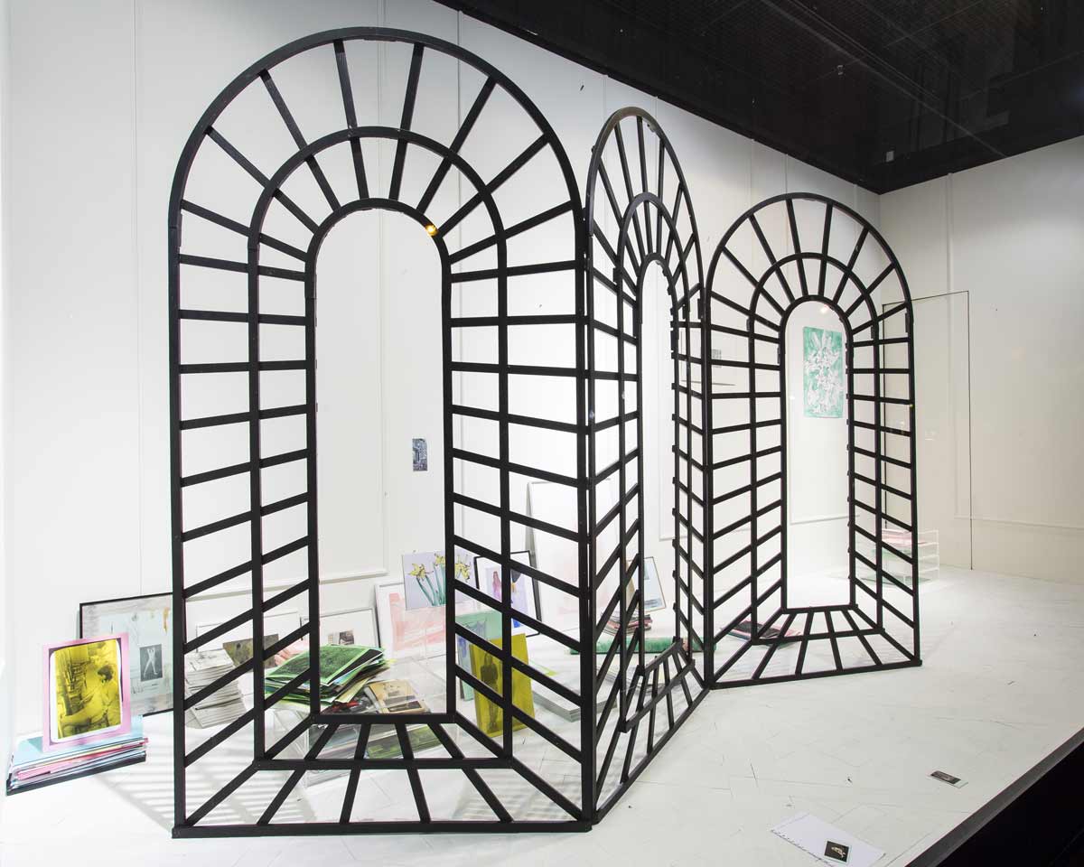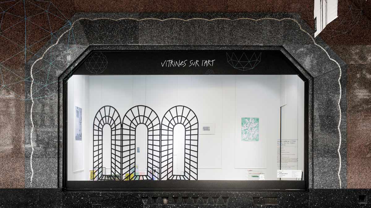 For this presentation of images, he plays with the codes of the window display in different paradoxical registers: showing/hiding, seducing/distancing… The artist takes into account the function of the premises and their special features, such as the reflections of light on the glass, the quality of the floors and walls… and makes these presentations an unusual drugstore, offered to passers-by. These presentations are based in particular on elements of latticework, a motif whose imaginary aspect refers to the world of winter gardens and to the history of window displays, approaching the outdated.