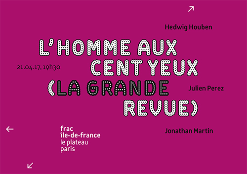 The new “revue” (show) L’Homme aux cent yeux * – in a nod to its glorious ancestors of the 30s and to the spirit of the Music Hall – proposes an annual programme of live interventions, open to all kinds of artistic creation (acoustic, filmic, choreographic, etc.), by artists invited to occupy the exhibition spaces in two phases. The first (la revue) will consist in evening events during the ongoing exhibitions, with a performative play specially created by an artist for each occasion. The second (la grande revue) will take place once during the year, in between exhibitions, when the spaces are empty and awaiting the next installation. For this event – the acme of the “revue” – all the invited artists will gather and propose a follow-up to their first intervention.