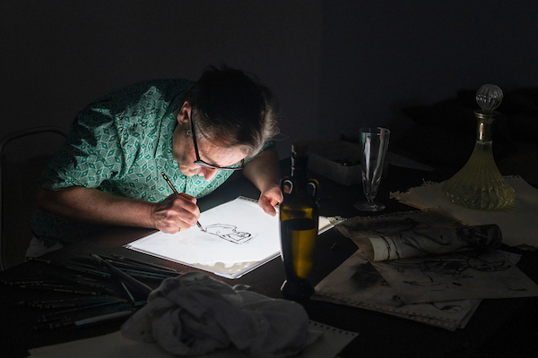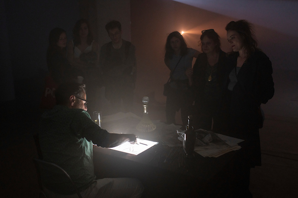 Il y a trois choses dans un lieu déserté. L’une dessine et projette, la deuxième balaye et fume, la dernière bourdonne et caresse. Au revers d’une table, dans le cône d’un phare, ou dans la gorge qui caverne, il y a trois choses qui remuent.