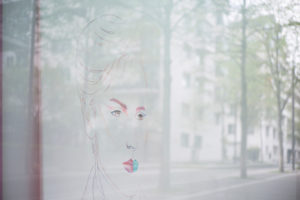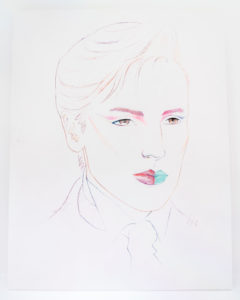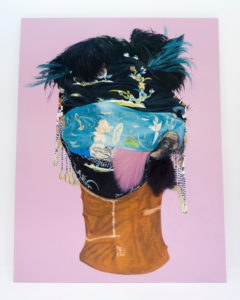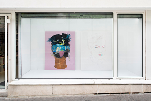 En vitrine, deux peintures sont au regard l’une de l’autre. Les deux portraits, réunis en un geste d’association de leurs différences, représentent des créatures androgynes qui nous interpellent.