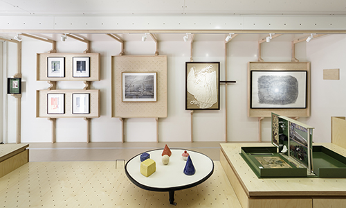 À partir de cet élément, deux pièces évoquent l’astre solaire : Solar Panel de Scoli Acosta et Soleil d’Hiver dessiné à l’aquarelle par Pierre Ardouvin. Ce dernier, avec ses multiples ondulations circulaires, trouve logiquement une suite dans les formes géométriques imaginées par Bevis Martin & Charlie Youle. First Notions C (Solids and cupcake) met en scène divers objets issus de manuels scolaires des années 1950-1970 pour illustrer la théorie des ensembles. Tel un corps étranger, le cupcake vient perturber ce jeu et assurer la promesse d’une récompense. Cette même approche ludique se rejoue dans les ardoises en relief de l’artiste designer Robert Stadler, endossant la fonction du tableau noir. Cette référence nous amène aux paysages rouges, quasi crayeux de Jean-Pascal Flavien.