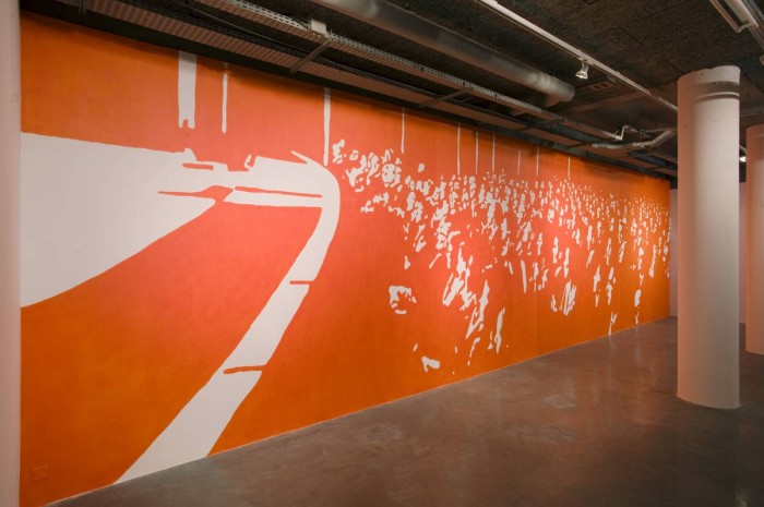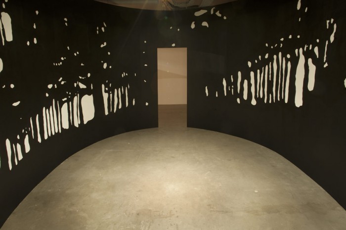 This link with the world of theatre recurs in Publikum, a wall-painting on two opposite walls showing a mirror-image of spectators watching a stage; in Forest III, simultaneously the front and back of a wrap-around set which the visitor can actually enter; and in the film 8, a loop at the heart of an installation which allows us to play with a new time/space relationship.
