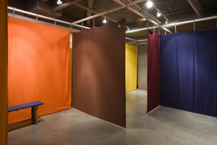 The exhibition begins with Curtain II, a broad drapery whose red and black trompe l’oeil diamond shapes are somewhat reminiscent of Harlequin’s costume.
