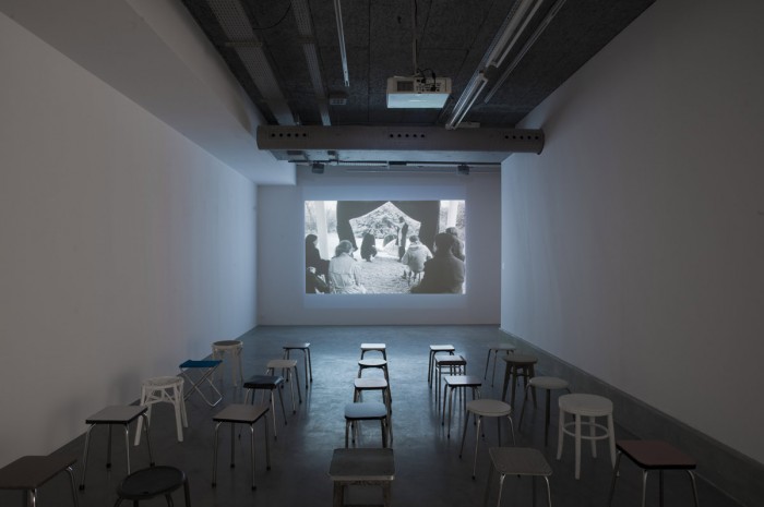 a modernist architectural setting presents men and women who doubtless have a shared history, but one we can only seize fragments of. Caught in everyday activities in near-empty rooms, the characters are systematically set in movement by the arrival of the camera, then move out of shot, becoming no more than ghostly figures.