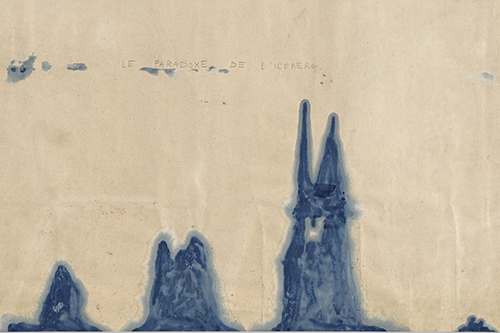 One of her watercolours in a dazzling blue wash gave the exhibition its title: ‘Le Paradoxe de l’iceberg’. It comprises two lines of mirror-inverted peaks. The iceberg shape, often visible in her work, shifts our attention to what is hidden. Indeed, the tip only forms a small portion, barely 10% of the total volume. This form encourages other dimensions of space to be considered, beyond what is visible. Furthermore, the iceberg also conveys the phenomenon of global warming and the gradual disappearance of sea ice. Is depicting the iceberg another way of capturing time and the vagaries of transformation?