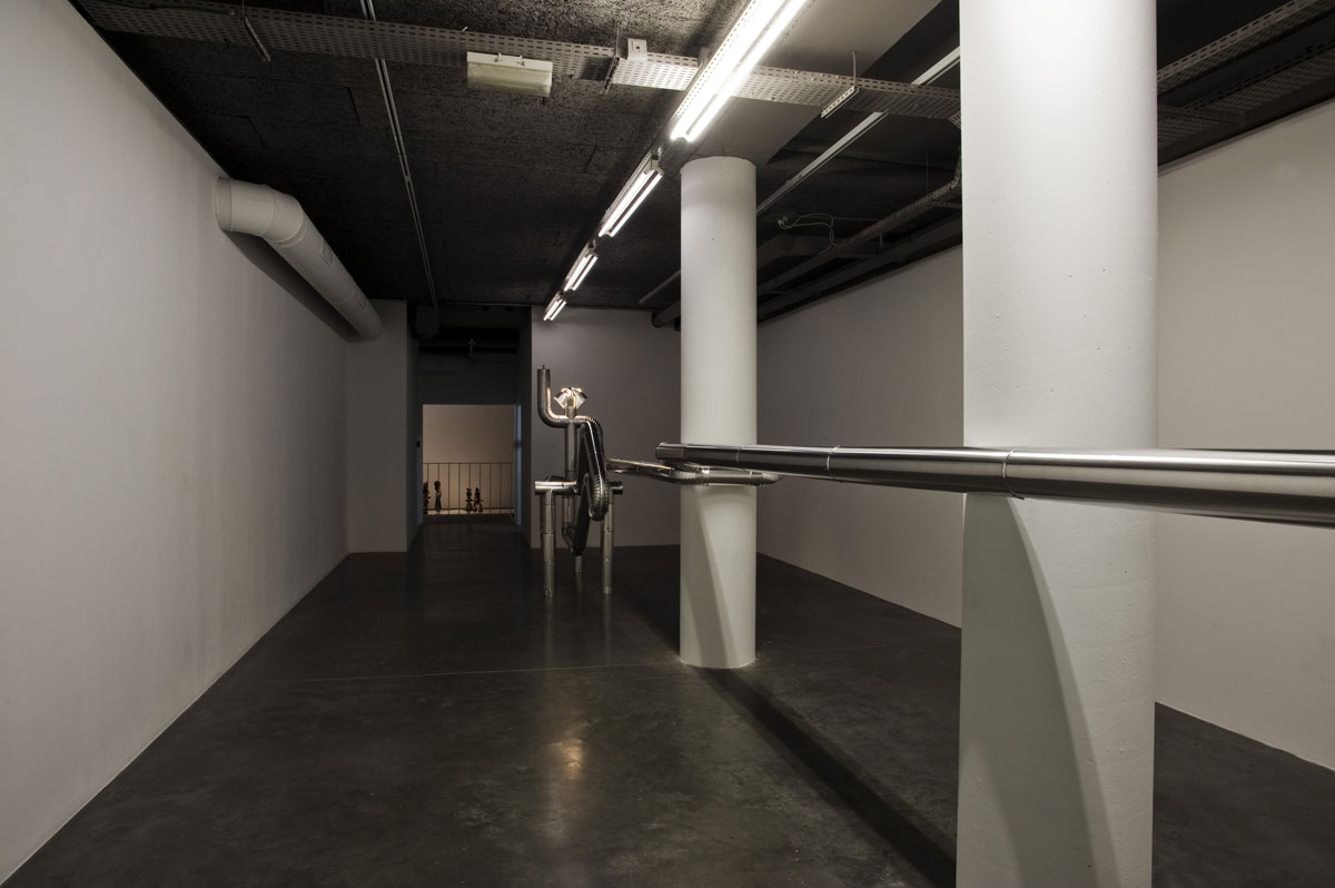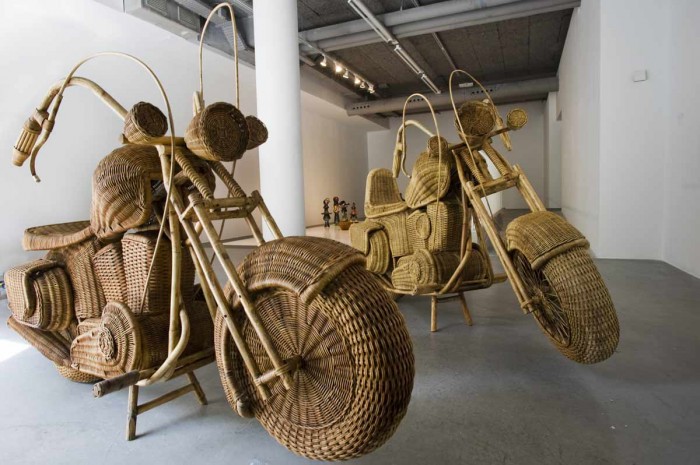 We remember his Ping-pong tables overlaid with a flying tracery of white balls in a frantically frozen mix of Muybridge and Tex Avery; collaged “molecules” of different animals made entirely of light bulbs; outlines of classical sculpture masterpieces cut from Vénilia decorative adhesive and using the manufacturer’s 300-odd patterns; freestanding drawings made with stovepipes – a new kind of artistic smokescreen – that invariably morph into Darth Vader, a gleaming Harley chopper or Marcel Breuer’s celebrated Vassily armchair.