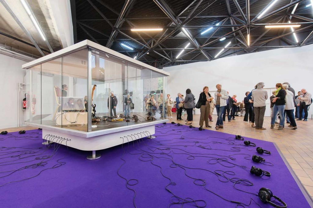 Every installation of the Kiosque électronique creates a new situation, an encounter between musicians, performers and a specific context which gives the public a synaesthetic experience, by turns poetic, funny and absurd. Le kiosque électronique is also a visual experience: at once, the show of musicians whose music is not heard, even though it is being played live, but also of the audience who becomes part of the show. This parallelepiped of glass and metal – which calls minimal sculpture to mind – offers the eyes of viewers and the ears of the audience novel and exciting visual and acoustic experiences.