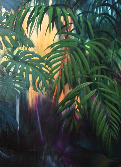 Romain Bernini développe depuis une dizaine d’années une œuvre picturale imprégnée de questionnements autour de l’espace, de la figuration et de l’abstraction, de la mythologie et de la culture populaire. Ses tableaux n’évoquent pas d’histoire particulière, si ce n’est celle d’une énigme, d’un temps suspendu. Les différentes couches, trouées, coulures laissées volontairement visibles et appliquées d’une manière trop immatérielle pour qu’on puisse rester à la surface, se superposent, s’enchevêtrent, créant le trouble. Pour la vitrine, l’artiste réalise un paysage luxuriant et énigmatique sur une toile aux dimensions de l’espace d’exposition, en plan resserré comme une forêt grandeur nature qui envahirait la ville.