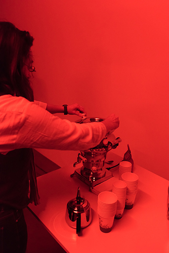 His magazine proposal is organised around a breakfast scene from Joseph Losey’s 1968 psycho-thriller. A film and a soundtrack specifically designed for the set reconstruct the elements in a frieze of gestures, patterns and sounds, which the public provided with a plant infusion is invited to experience.