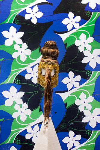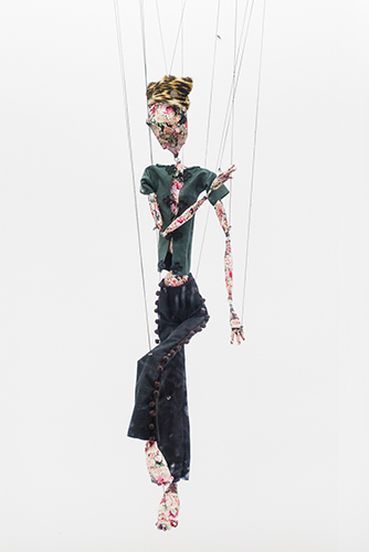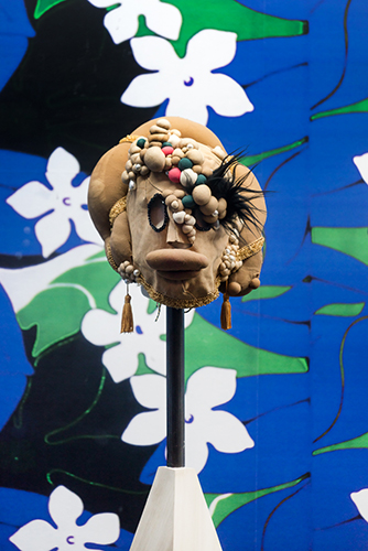 Pour la vitrine de l’antenne culturelle, l’artiste propose de confronter des motifs décoratifs de tapisseries et de tapis aux figures de marionnettes et de masques créés pour cette installation. Figures prêtes à être portées ou animées, elles deviennent sculptures qui se confondent aussi bien qu’elles se détachent des motifs ornant le papier peint spécifiquement conçu pour cette vitrine.