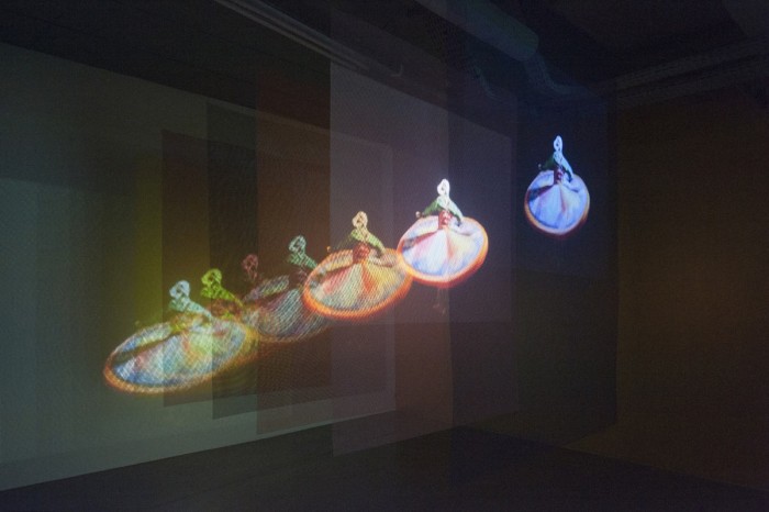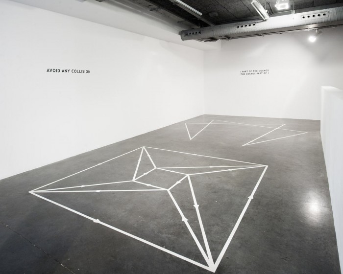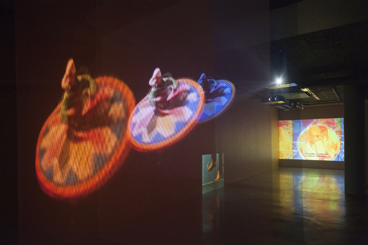 Through Somnambular Laws dictates a slowed-down reading process and introduces a fluidity where there is no reason to tell imagination and reality apart. This twosome mixes factual elements with factors borrowed from literature, film, music, theatre and dance, which they get to dialogue together, using ricochets. In the exhibition’s last room, using this logic, they have come up with a performance-related space where there is a stand-off between the geometric figures of a Beckett play (Quad – a square) and a Gurdjieff [4] ballet (the enigmatic figure of the Enneagram – a figure (gramme) with nine (ennea) points). Just like in their films and installations, the ideas of strolling (from one point to another) and displacement (from the self to the other) culminate in a set of actions, a praxis – as opposed to a contemplation – which once again questions being-together.