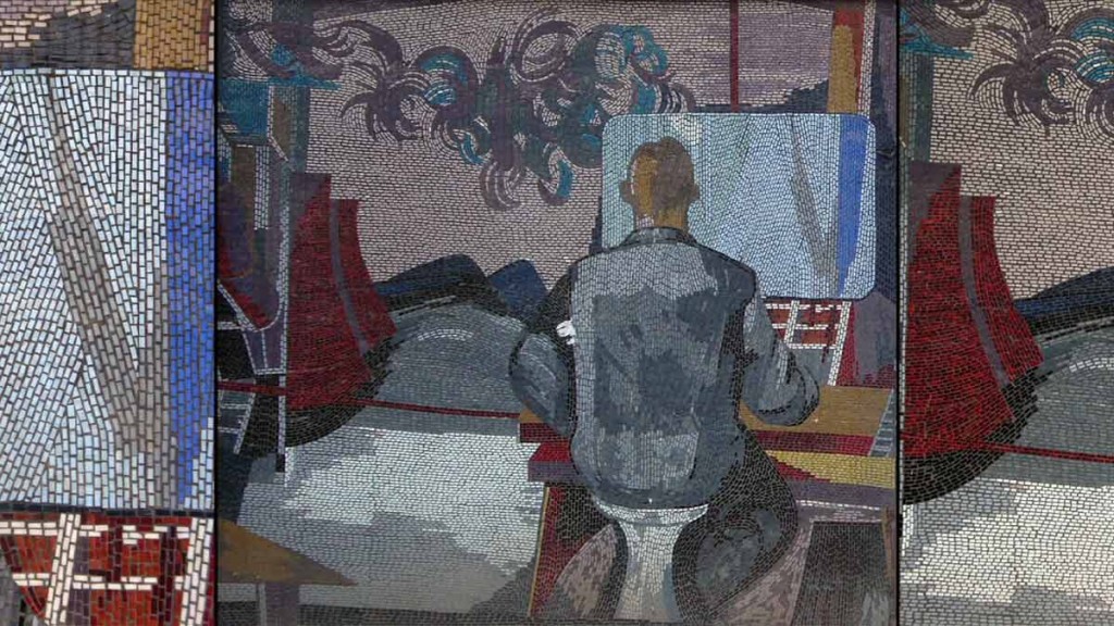 Der Stillstand ist die Explosion, die Explosion der Stillstand (WIR der gefrorene Sturm)[3] makes a crossing in “a time wall”. The words—exchanged by telephone—are cut-ups of poetic and theoretical writings by Heiner Müller, and the images are close-ups of a mosaic dating from East German days, depicting the conquest of space or, rather, “a dead star on which a rescue team from another day and age, or another space, hears a voice and discovers a corpse.”