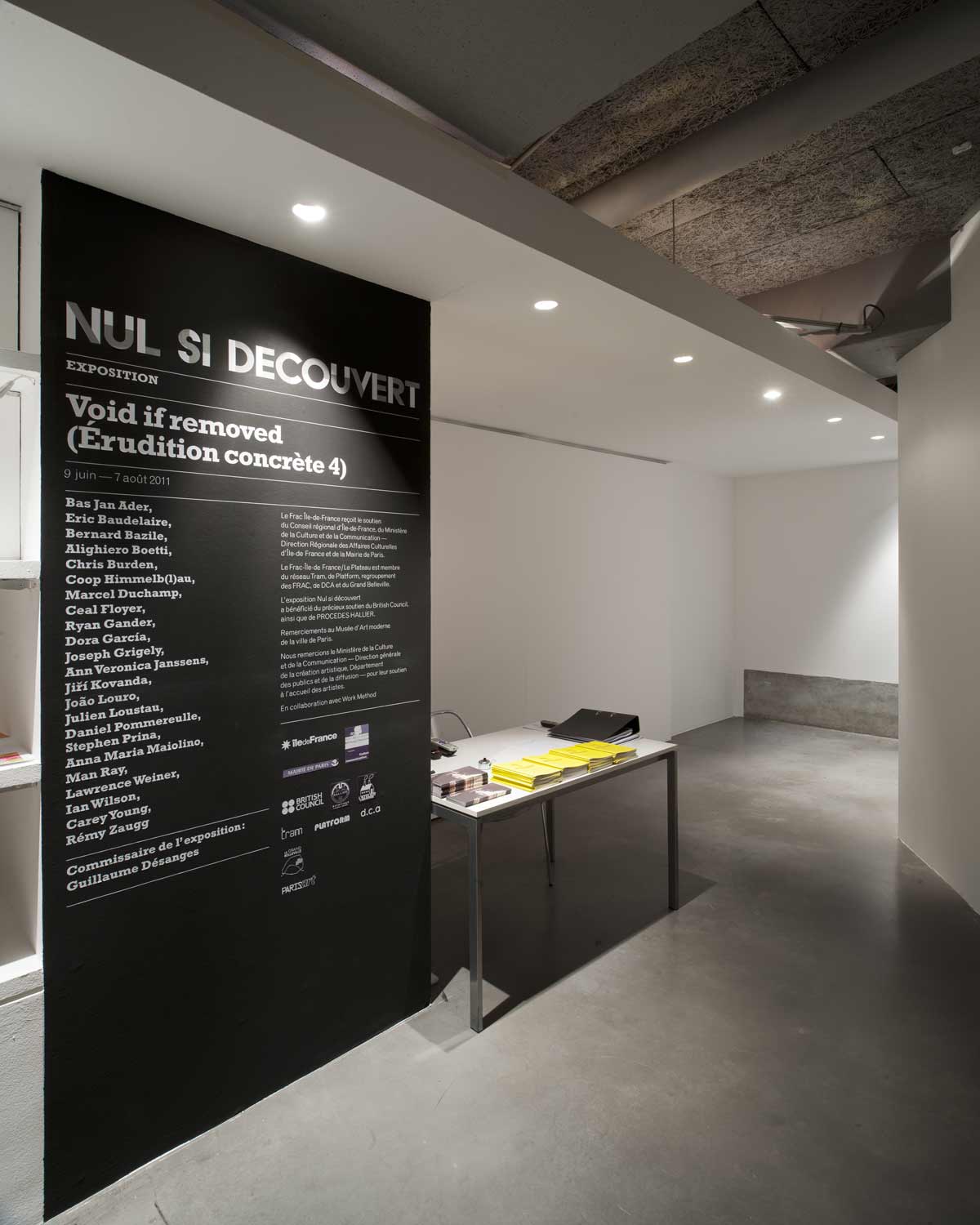 Nul si découvert/Void if Removed is the fourth and last part of the Concrete Erudition programme proposed by Guillaume Désanges, the guest curator invited to devise a cycle of exhibitions at Le Plateau since 2009. In creating a continuity with previous shows, Watchmen, Liars, Dreamers, Planet of Signs and Prisoners of the Sun, which all question the relationship between knowledge and access thereto, this exhibition, this time around, takes as its point of departure three stories, in order to broach, in art, the idea of experiences which are at once conceivable and impossible.